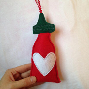 Mushpa + Mensa’s brand spanking new, limited time only, Eco-Fi felt (made from recycled plastic bottles) Sriracha hot sauce ornament, which contains dried lavender flowers in the stuffing. Each one is unique in their own way. Sriracha Hot Sauce ornaments are all made by hand, hand-stitched, and hand-stuffed.