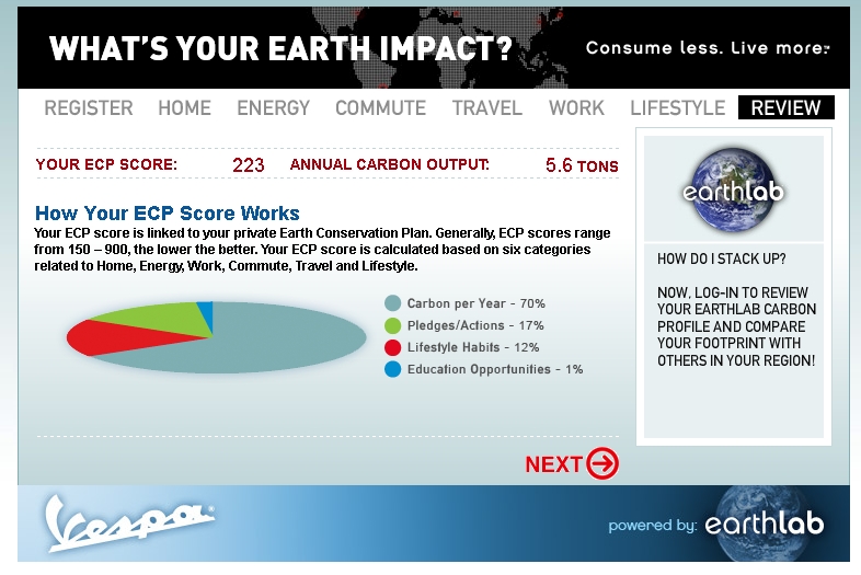 The first chapter is about measuring your carbon footprint. The site David Bach recommends is www.earthlab.com/createprofile. I went and set up a profile and answered their questions. My results are below: