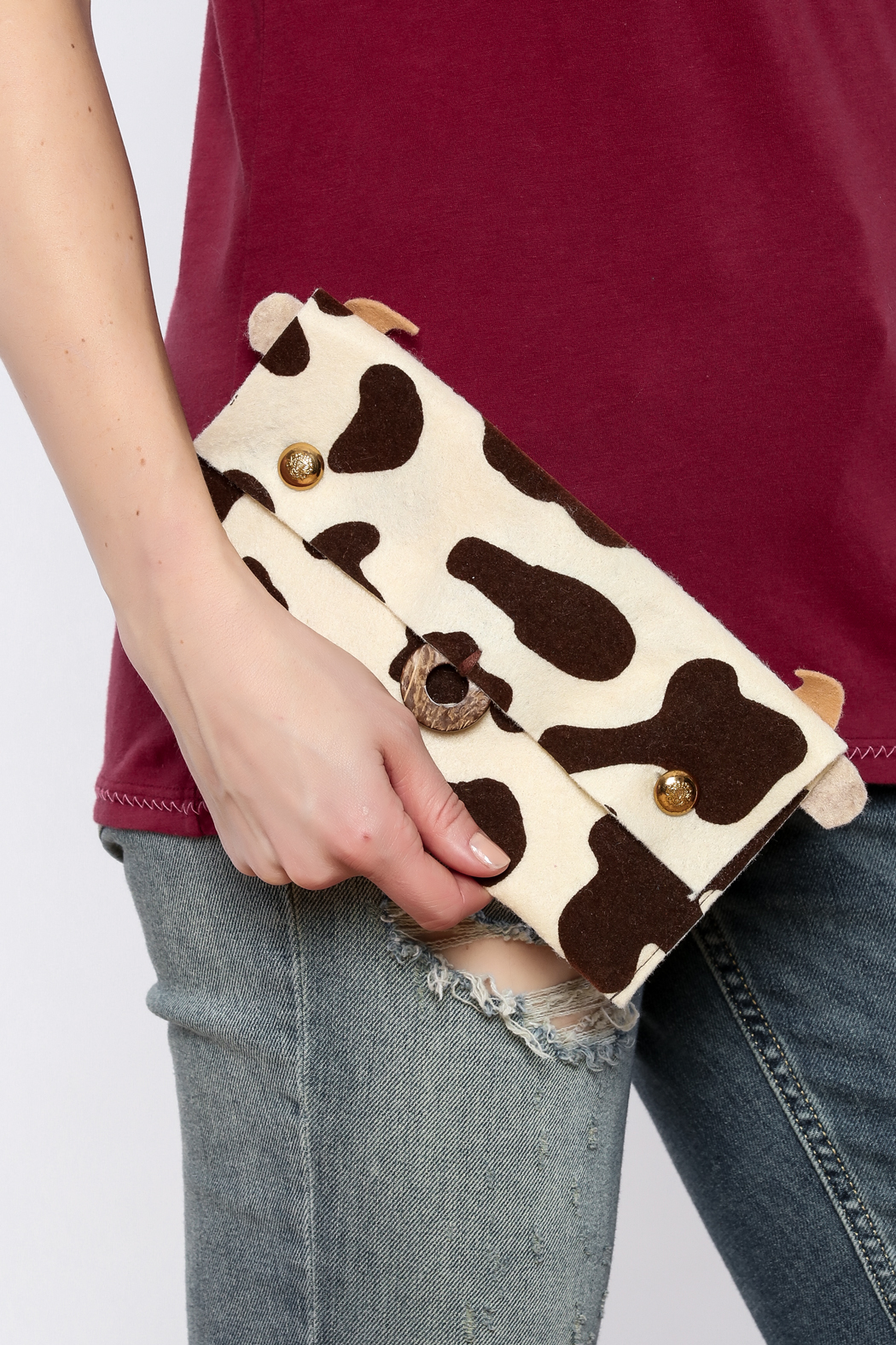 This Cow Clutch is handmade from deliciously soft Eco-Fi cow print felt which is made of recycled plastic bottles and has vintage buttons as eyes. It is a perfect clutch to hold your money, credit cards, and a lipstick, which is all you really need for a glamorous night on the town. Accessorize with the perfect black dress or a nice top and pair of jeans for a casual dinner with friends or date night!