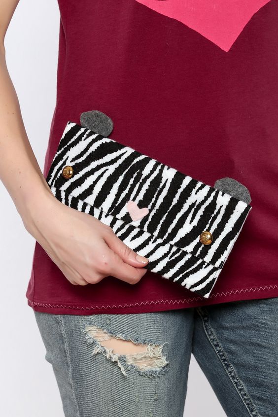 This Zebra Clutch is handmade from deliciously soft Eco-Fi zebra print felt which is made of recycled plastic bottles and has vintage buttons as eyes. It is a perfect clutch to hold your money, credit cards, and a lipstick, which is all you really need for a glamorous night on the town. Accessorize with the perfect black dress or a nice top and pair of jeans for a casual dinner with friends or date night!