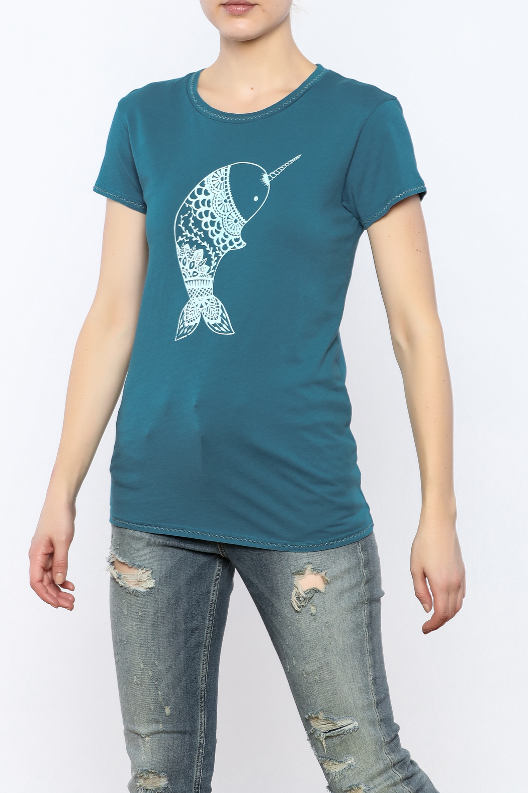 Nellie the Narwhal is hand printed, on a super soft, 100% organic cotton female crew t-shirt, and sports an amazing design made using only eco-friendly water based inks.