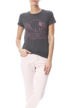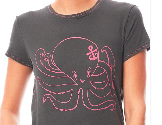 Olivia the Octopus is hand printed, on a super soft, 100% organic cotton female crew t-shirt, and sports an amazing design made using only eco-friendly water based inks. You’re welcome.