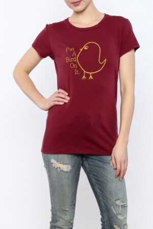 Put A Bird On It is hand printed, on a super soft, 100% organic cotton female crew t-shirt, and sports an amazing design made using only eco-friendly water based inks.