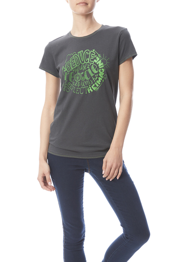 R6 – Reduce, ReUse, Recycle, Replenish, Reflect, ReImagine is hand printed, on a super soft, 100% organic cotton female crew t-shirt, and sports an amazing design made using only eco-friendly water based inks. You’re welcome!